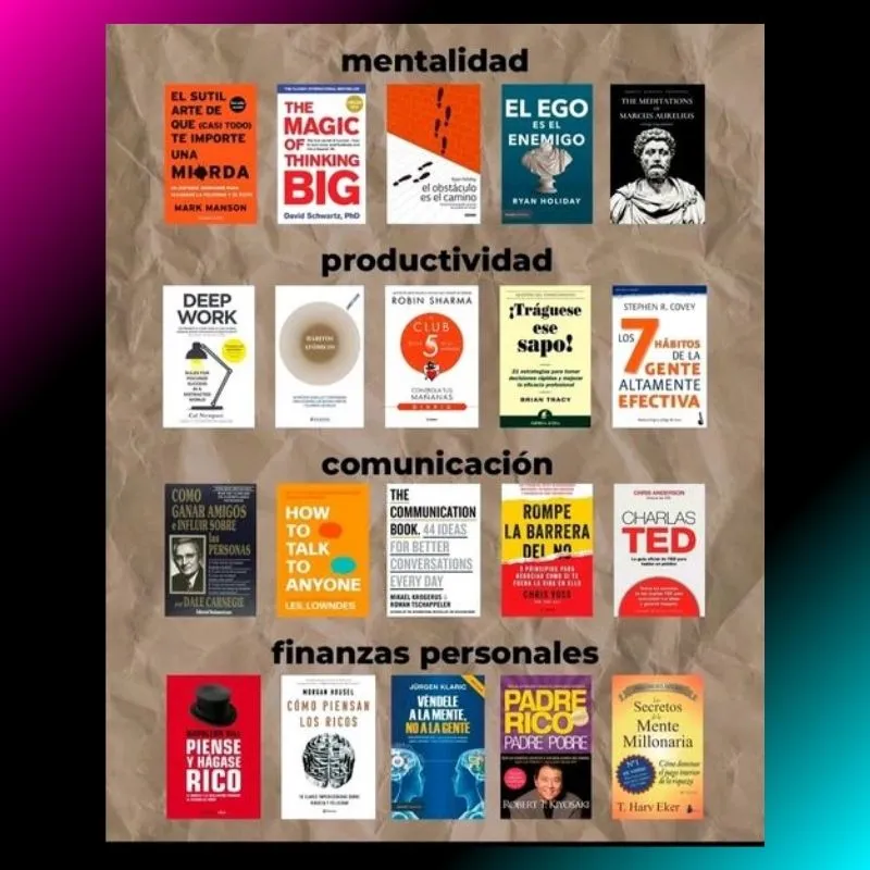 - Libros de Superación Personal: Desarrolla tu potencial al máximo y alcanza la excelencia en todas las áreas de tu vida. Aprende a superar obstáculos, cultivar una mentalidad positiva y establecer objetivos ambiciosos que te impulsen hacia el éxito.